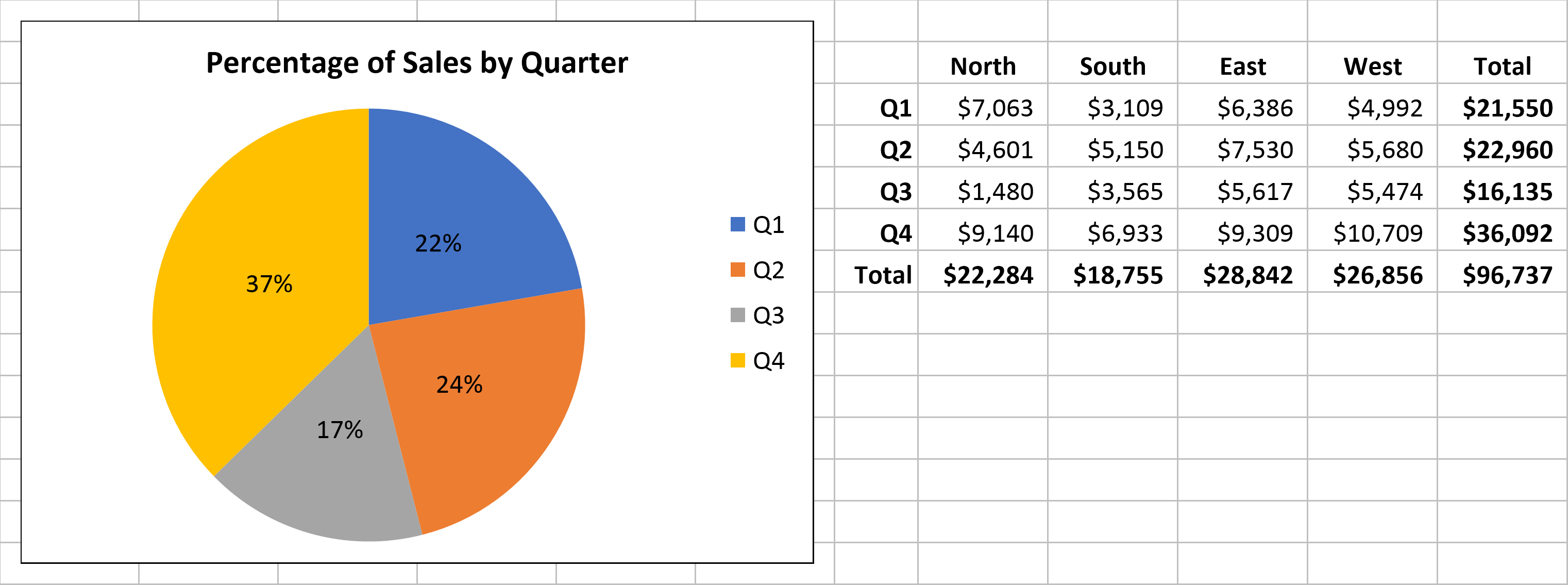 Other API Samples Pie Chart SpreadsheetGear API SampleCharting Basic Pie ChartDescriptionDemonstrates generating a basic Pie Chart.Sample Source Code// Open workbook with some data for the chart and get a reference to the active // sheet and its cells. SpreadsheetGear.IWorkbook workbook = SpreadsheetGear.Factory.GetWorkbook("ChartData.xlsx"); SpreadsheetGear.IWorksheet worksheet = workbook.ActiveWorksheet; SpreadsheetGear.IRange cells = worksheet.Cells; // Get a reference to the worksheet window info and shapes collection. SpreadsheetGear.IWorksheetWindowInfo windowInfo = worksheet.WindowInfo; SpreadsheetGear.Shapes.IShapes shapes = worksheet.Shapes; // Add a chart to the worksheet's shape collection. // NOTE: Calculate the coordinates of the chart by converting row and column // coordinates to points. Use fractional row and column values to get // coordinates anywhere in between row and column boundaries. double left = windowInfo.ColumnToPoints(0.15); double top = windowInfo.RowToPoints(0.5); double right = windowInfo.ColumnToPoints(5.85); double bottom = windowInfo.RowToPoints(13.5); SpreadsheetGear.Charts.IChart chart = shapes.AddChart(left, top, right - left, bottom - top).Chart; // Get the source data range from an existing defined name. SpreadsheetGear.IRange source = workbook.Names["TotalByQuarter"].RefersToRange; // Set the chart's source data range, plotting series in columns. chart.SetSourceData(source, SpreadsheetGear.Charts.RowCol.Columns); // Set the chart type to a pie chart. chart.ChartType = SpreadsheetGear.Charts.ChartType.Pie; // Get a reference to the single total series. SpreadsheetGear.Charts.ISeries seriesTotal = chart.SeriesCollection[0]; // Add category labels by using an existing defined name. seriesTotal.XValues = "=Quarters"; // Add series data labels and change to show percentage only. seriesTotal.HasDataLabels = true; seriesTotal.DataLabels.ShowPercentage = true; seriesTotal.DataLabels.ShowValue = false; // Add a chart title and change the font size. chart.HasTitle = true; chart.ChartTitle.Text = "Percentage of Sales by Quarter"; chart.ChartTitle.Font.Size = 12;