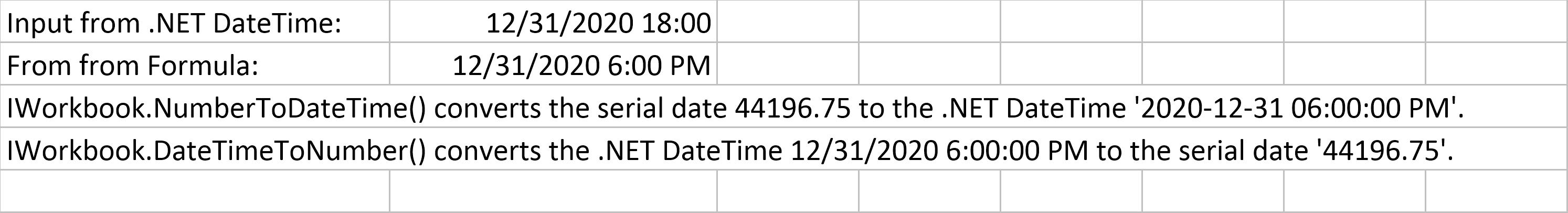 *NOTE: although uncommon, Excel files do offer an alternative Date1904 mode where a serial numeric date value of 0 corresponds to January 1, 1904. This mode is typically not used for the most part, but SpreadsheetGear does support it if a workbook uses it.