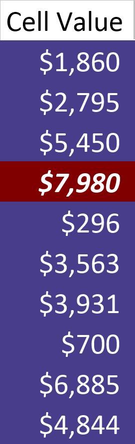 Other API Samples Cell Value SpreadsheetGear API SampleRange Samples Conditional Formats Cell ValueDescriptionCreate a Cell Value Conditional Format.Sample Source Code// Create a new workbook and some local variables. SpreadsheetGear.IWorkbook workbook = SpreadsheetGear.Factory.GetWorkbook(); SpreadsheetGear.IWorksheet worksheet = workbook.ActiveWorksheet; SpreadsheetGear.IRange cells = worksheet.Cells; // Add a title to a cell. cells["A1"].Formula = "Cell Value"; // Get a reference to a range of cells. SpreadsheetGear.IRange range = cells["A2:A11"]; // Load random data and format as $ using multiple cell range. range.Formula = "=RAND() * 10000"; range.NumberFormat = "$#,##0_);($#,##0)"; // Get a reference to the range's conditional formats collection. SpreadsheetGear.IFormatConditions conditions = range.FormatConditions; // Add a conditional format for values less than or equal to 7000. SpreadsheetGear.IFormatCondition condition = conditions.Add( SpreadsheetGear.FormatConditionType.CellValue, SpreadsheetGear.FormatConditionOperator.LessEqual, "7000", null); // Set font and interior formatting options. condition.Font.Bold = false; condition.Font.Color = SpreadsheetGear.Colors.White; condition.Interior.Color = SpreadsheetGear.Colors.DarkSlateBlue; // Add a conditional format for values greater than 7000. condition = conditions.Add( SpreadsheetGear.FormatConditionType.CellValue, SpreadsheetGear.FormatConditionOperator.Greater, "7000", null); // Set font and interior formatting options. condition.Font.Bold = true; condition.Font.Italic = true; condition.Font.Color = SpreadsheetGear.Colors.White; condition.Interior.Color = SpreadsheetGear.Colors.Maroon;