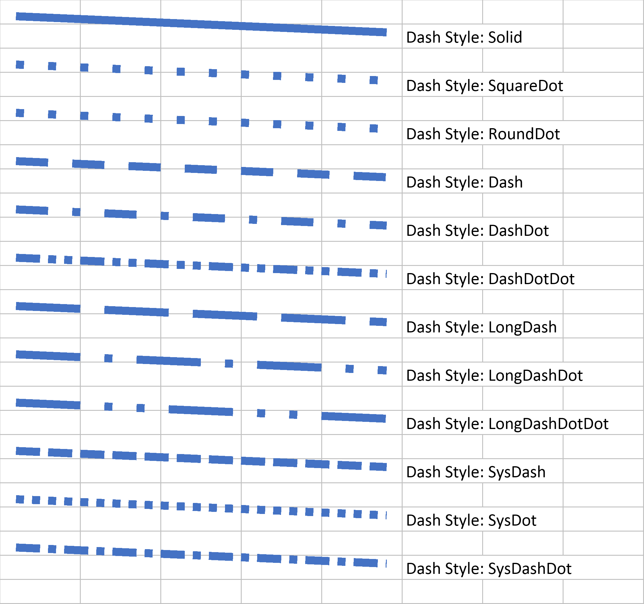Other API Samples Line Dash Style SpreadsheetGear API SampleShapes Lines Line Dash StyleDescriptionAdds lines using all of the various dash styles defined in SpreadsheetGear.Shapes.LineDashStyle.Sample Source Code// Create a new workbook and some local variables. SpreadsheetGear.IWorkbook workbook = SpreadsheetGear.Factory.GetWorkbook(); SpreadsheetGear.IWorksheet worksheet = workbook.ActiveWorksheet; SpreadsheetGear.IWorksheetWindowInfo windowInfo = worksheet.WindowInfo; // We will position lines relative to a given range, starting in Row 2. SpreadsheetGear.IRange currentRow = worksheet.Cells["2:2"]; // Position line across Columns A:E double xStart = 10; double xEnd = windowInfo.ColumnToPoints(5) - 10; // Convert LineDashStyle enum options into an IEnumerable. var lineDashStyles = System.Enum.GetValues(typeof(SpreadsheetGear.Shapes.LineDashStyle)) .OfType<SpreadsheetGear.Shapes.LineDashStyle>(); // Iterate over each Dash Style. foreach (var lineDashStyle in lineDashStyles) { // Position line relative to "currentRow" and add a slight slant to it. double yStart = windowInfo.RowToPoints(currentRow.Row) - 5; double yEnd = yStart + 10; // Add the line and set its weight. SpreadsheetGear.Shapes.IShape lineShape = worksheet.Shapes.AddLine(xStart, yStart, xEnd, yEnd); SpreadsheetGear.Shapes.ILineFormat lineFormat = lineShape.Line; lineFormat.Weight = 5; // Set Dash Style lineFormat.DashStyle = lineDashStyle; // Provide some information in an adjacent cell to indicate dash style. currentRow[0, 5].Value = $"Dash Style: {lineDashStyle}"; // Offset down 2 rows from the current row to prep next line. currentRow = currentRow.Offset(2, 0); }