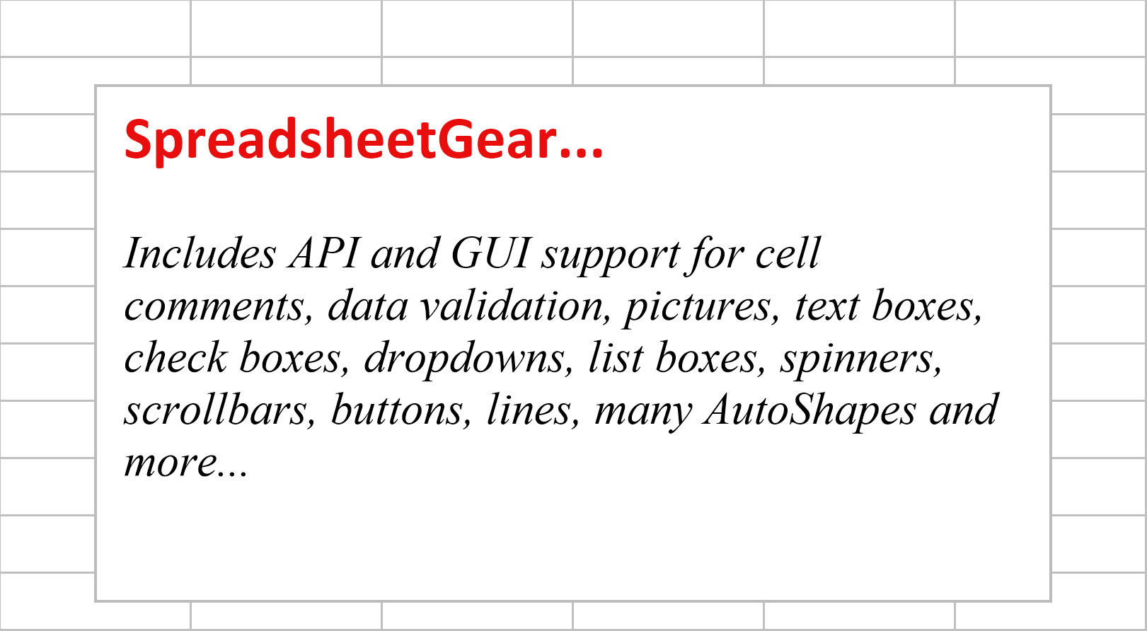 Other API Samples TextBox SpreadsheetGear API SampleShapes TextBoxDescriptionAdd a textbox to a worksheet and set the text and font.Sample Source Code// Create a new workbook and get a reference to the active worksheet and window info. SpreadsheetGear.IWorkbook workbook = SpreadsheetGear.Factory.GetWorkbook(); SpreadsheetGear.IWorksheet worksheet = workbook.ActiveWorksheet; SpreadsheetGear.IWorksheetWindowInfo windowInfo = worksheet.WindowInfo; // Calculate the left, top, width and height of the textbox by // converting row and column coordinates to points. Use fractional // values to get coordinates in between row and column boundaries. double left = windowInfo.ColumnToPoints(0.5); double top = windowInfo.RowToPoints(1.5); double right = windowInfo.ColumnToPoints(5.5); double bottom = windowInfo.RowToPoints(10.5); double width = right - left; double height = bottom - top; // Add the textbox using the calculated bounds. SpreadsheetGear.Shapes.IShape shape = worksheet.Shapes.AddTextBox(left, top, width, height); // Get a reference to the shape's textframe and characters. SpreadsheetGear.Shapes.ITextFrame textFrame = shape.TextFrame; SpreadsheetGear.ICharacters characters = textFrame.Characters; // Set the text to display in the textbox. characters.Text = "SpreadsheetGear...\r\n\r\nIncludes API and " + "GUI support for cell comments, data validation, " + "pictures, text boxes, check boxes, dropdowns, " + "list boxes, spinners, scrollbars, buttons, lines, " + "many AutoShapes and more..."; // Set various font options to all text in the TextBox. SpreadsheetGear.IFont font = characters.Font; font.Italic = true; font.Name = "Times New Roman"; font.Size = 12; // Demonstrating specifying rich text by applying various formatting // options to only the first line. characters = textFrame.GetCharacters(0, "SpreadsheetGear...".Length); characters.Font.Name = "Calibri"; characters.Font.Italic = false; characters.Font.Bold = true; characters.Font.Size = 16; characters.Font.Color = SpreadsheetGear.Color.FromArgb(255, 233, 14, 14); // Select the textbox. shape.Select(true);