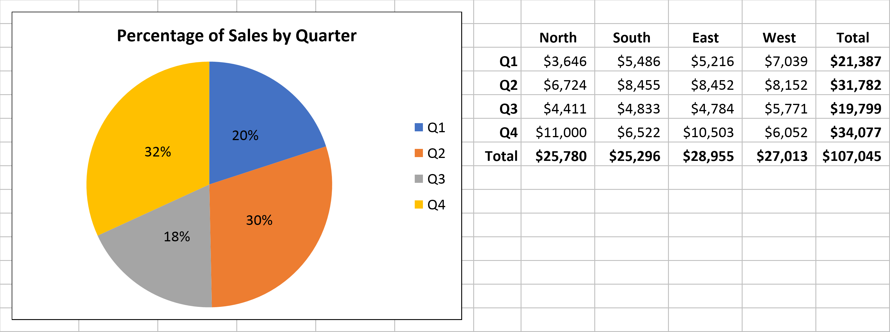 ISeries.XValueswhich are sourced from another Defined Name "Quarters" which points to the rangeG3:G6and so will use the axis labels "Q1", "Q2", "Q3" and "Q4". - Add data labels to each pie slice (