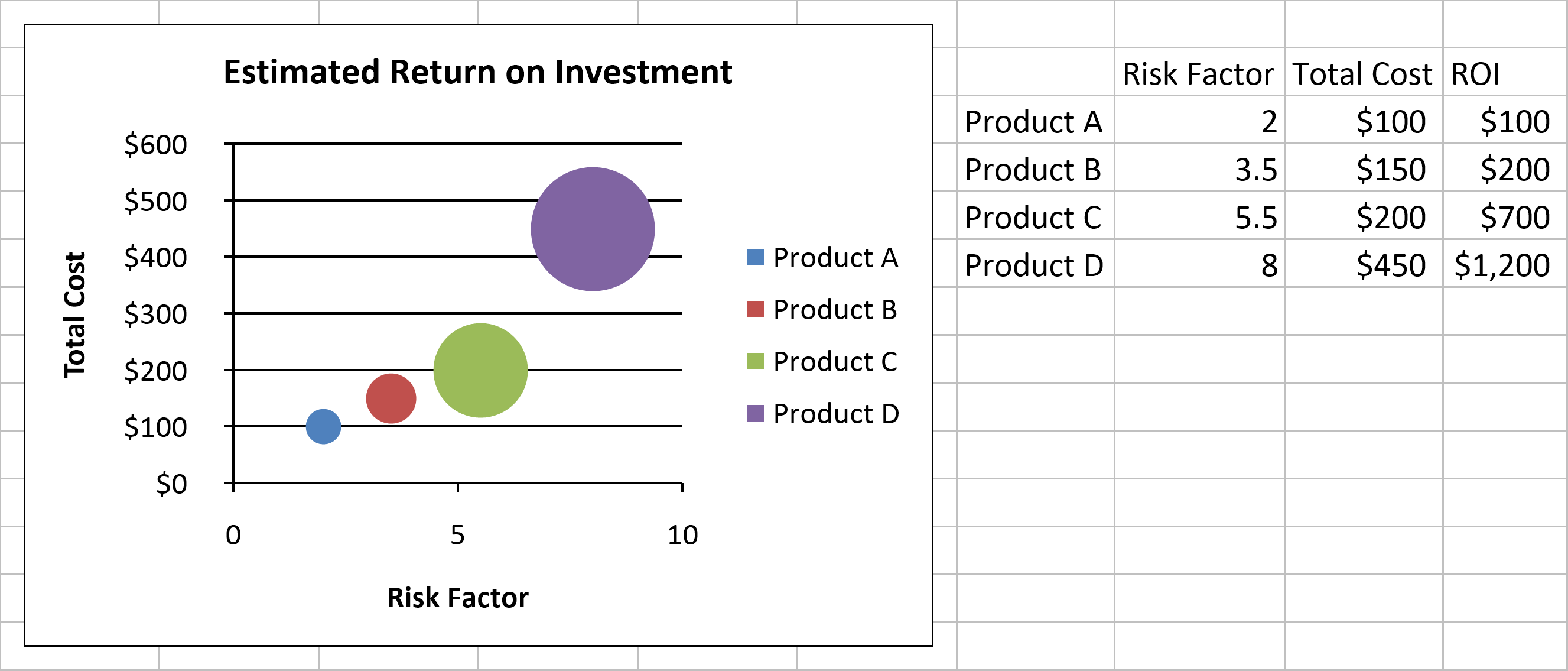 C# Bubble Chart SpreadsheetGear API SampleExcel-Compatible Samples for .NET Other C# API SamplesDescriptionCreate a bubble chart representing three sets of data values.Sample C# Source Code// Create a new workbook and get a reference to the active worksheet, window info, // and cells. SpreadsheetGear.IWorkbook workbook = SpreadsheetGear.Factory.GetWorkbook("ChartData-Bubble.xlsx"); SpreadsheetGear.IWorksheet worksheet = workbook.ActiveWorksheet; SpreadsheetGear.IWorksheetWindowInfo windowInfo = worksheet.WindowInfo; SpreadsheetGear.IRange cells = worksheet.Cells; // Add a chart to the worksheet's shape collection. // NOTE: Calculate the coordinates of the chart by converting row and column // coordinates to points. Use fractional row and column values to get // coordinates anywhere in between row and column boundaries. double left = windowInfo.ColumnToPoints(0.15); double top = windowInfo.RowToPoints(0.5); double right = windowInfo.ColumnToPoints(5.85); double bottom = windowInfo.RowToPoints(13.5); SpreadsheetGear.Charts.IChart chart = worksheet.Shapes.AddChart(left, top, right - left, bottom - top).Chart; // Set the chart type to bubble. chart.ChartType = SpreadsheetGear.Charts.ChartType.Bubble; // Get the chart's source data range. SpreadsheetGear.IRange source = cells["G3:J6"]; // for each row in the data range... for (int row = 0; row < source.RowCount; row++) { // Add a series to the chart's series collection. SpreadsheetGear.Charts.ISeries series = chart.SeriesCollection.Add(); // Set the series name, x values, y values, and bubble size values. series.Name = "=" + source[row, 0].Address; series.XValues = source[row, 1]; series.Values = source[row, 2]; series.BubbleSizes = source[row, 3]; } // Get a reference to the x value axis, add a title, and link the title to a cell. SpreadsheetGear.Charts.IAxis xValueAxis = chart.Axes[SpreadsheetGear.Charts.AxisType.Category]; xValueAxis.HasTitle = true; xValueAxis.AxisTitle.Text = "=H2"; // Get a reference to the y value axis, add a title, and link the title to a cell. SpreadsheetGear.Charts.IAxis yValueAxis = chart.Axes[SpreadsheetGear.Charts.AxisType.Value]; yValueAxis.HasTitle = true; yValueAxis.AxisTitle.Text = "=I2"; // Add a chart title and change the font size. chart.HasTitle = true; chart.ChartTitle.Text = "Estimated Return on Investment"; chart.ChartTitle.Font.Size = 12;