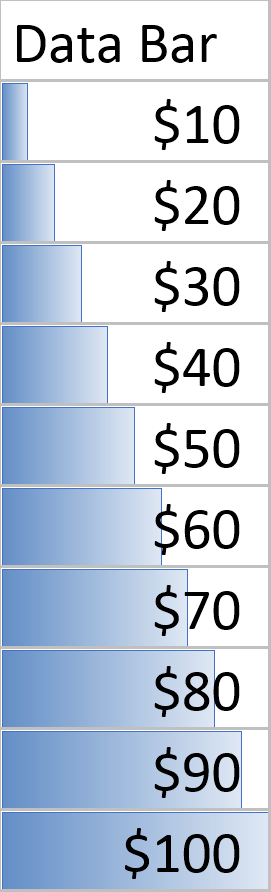 C# Data Bar SpreadsheetGear API SampleExcel-Compatible Samples for .NET Other C# API SamplesDescriptionCreate a Data Bar Conditional Format.Sample C# Source Code// Create a new workbook and some local variables. SpreadsheetGear.IWorkbook workbook = SpreadsheetGear.Factory.GetWorkbook(); SpreadsheetGear.IWorksheet worksheet = workbook.ActiveWorksheet; SpreadsheetGear.IRange cells = worksheet.Cells; // Add a title to a cell. cells["A1"].Formula = "Data Bar"; // Get a reference to a range of cells. SpreadsheetGear.IRange range = cells["A2:A11"]; // Load data and format as $ using multiple cell range. range.Formula = "=ROW() * 10 - 10"; range.NumberFormat = "$#,##0_);($#,##0)"; // Get a reference to the range's conditional formats collection. SpreadsheetGear.IFormatConditions conditions = range.FormatConditions; // Add data bar conditional format. SpreadsheetGear.IFormatCondition condition = conditions.AddDatabar(); // Get a reference to the data bar condition. SpreadsheetGear.IDatabar dataBar = condition.Databar; // Get a reference to the data bar border and apply formatting. SpreadsheetGear.IDataBarBorder barBorder = dataBar.BarBorder; barBorder.Type = SpreadsheetGear.DataBarBorderType.Solid; barBorder.Color.ThemeColor = SpreadsheetGear.Themes.ColorSchemeIndex.Accent1; // Set min and max scale values. dataBar.MinPoint.Modify(SpreadsheetGear.ConditionValueTypes.Number, 0); dataBar.MaxPoint.Modify(SpreadsheetGear.ConditionValueTypes.Number, 100);